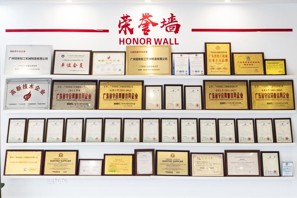 本公司建立了健全的产品生产制造质量检验及质量保证体系,通过了CE认证及ISO9001质量管理体系认证。公司内部还实现了产品的3Q检测确认。本公司还是广东省质量管理协会、广东省质量检验协会的理事会员。2012年9月,“冠和”荣获灌装机十大知名品牌奖,向社会各界展示了本公司在行业内的领先地位。公司还荣获了“守合同重信用企业”荣誉证书。